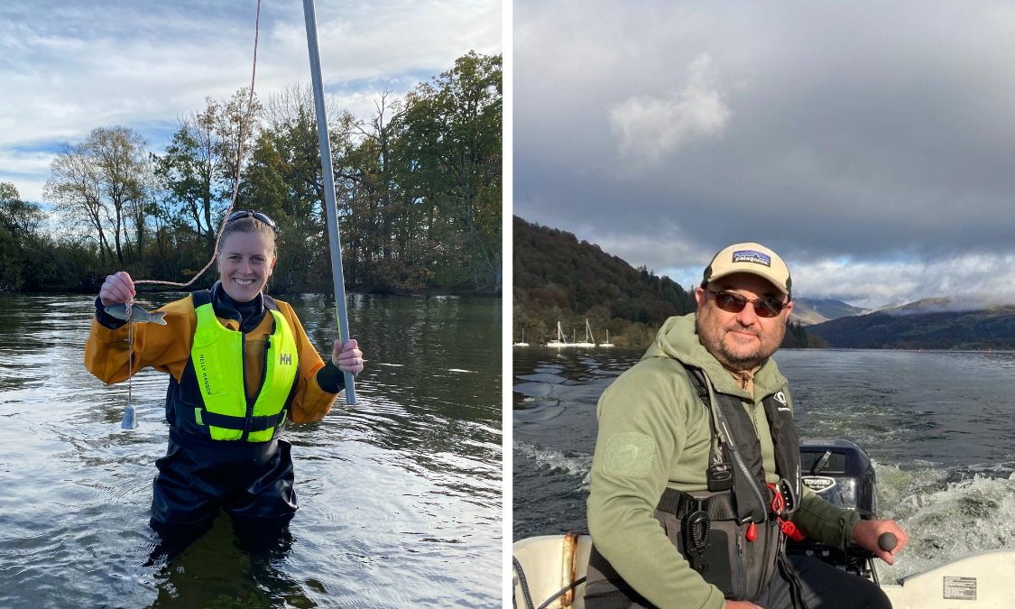 Left: Calibrating the project's hydroacoustic kit - using a toy trout and a heavy weight! Right: The author afloat on Lake Windermere.