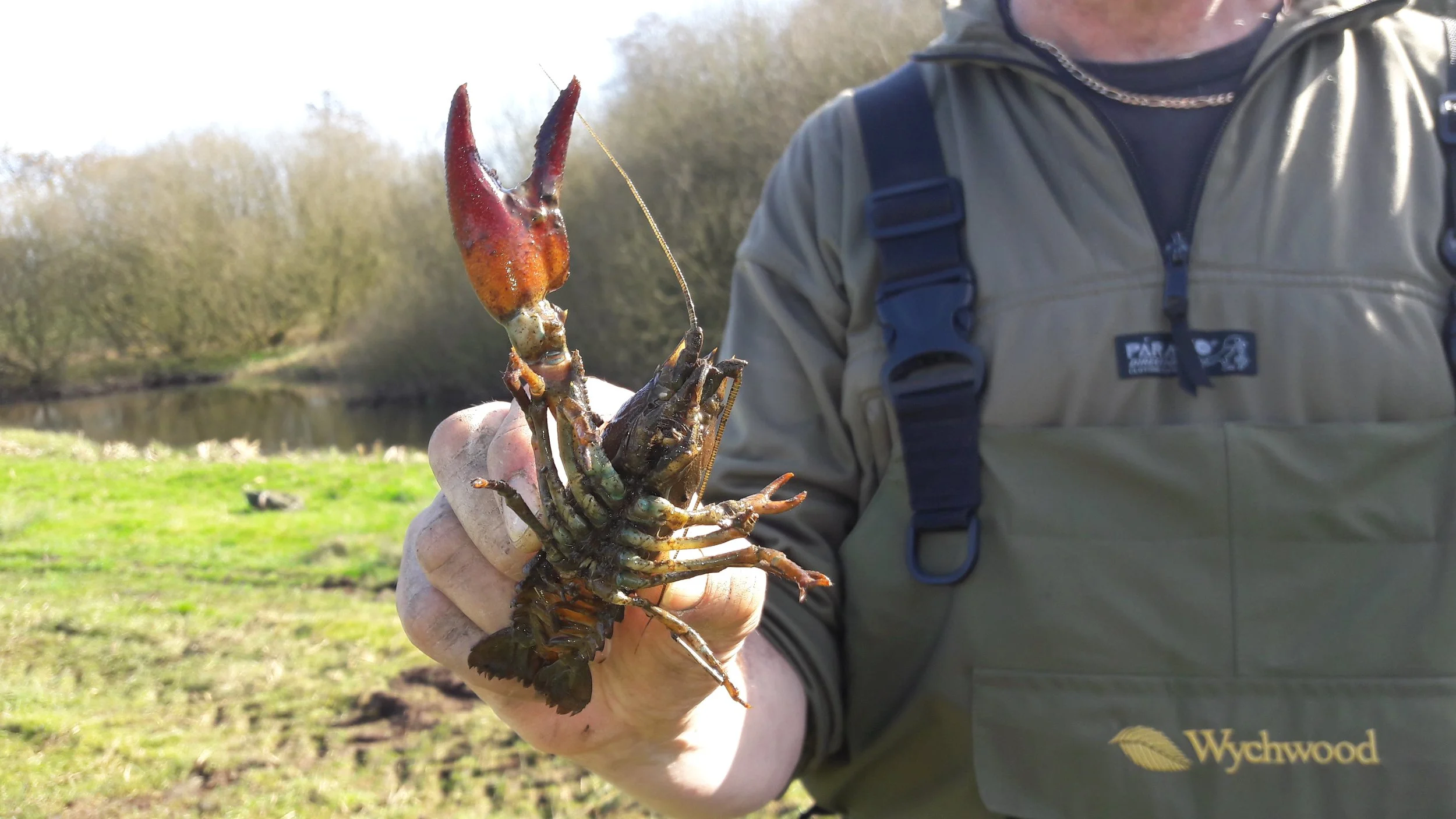 Tim Ellis (left) holding a signal crayfish on the banks of the Wensum. An invasive species, which in conjunction with Himalayan balsam causes huge amounts of bank damage, erosion and sediment ingress (right).
